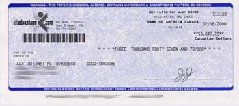 Check received by a friend in November, 1999 for